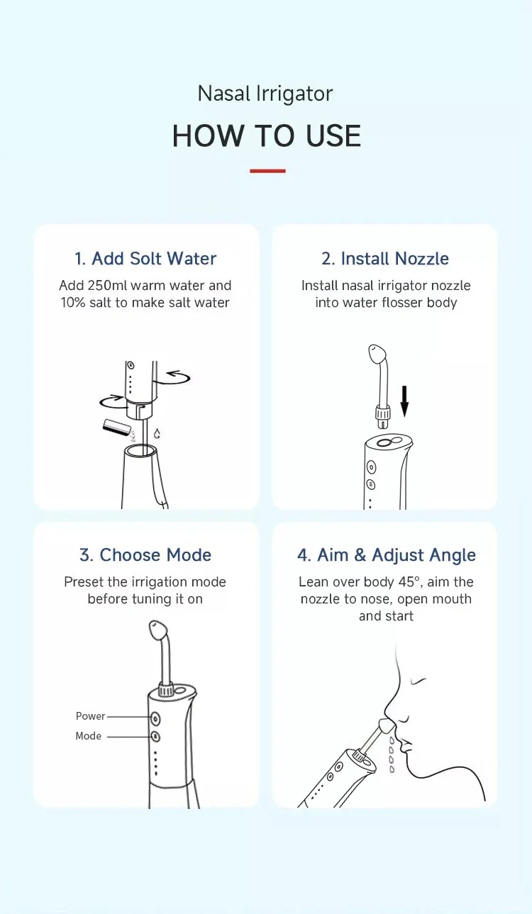 【90 გრადუსიანი მბრუნავი წვერები】 ცხვირის გამწმენდის 90 გრადუსიანი მბრუნავი წვერის დიზაინი უფრო ეფექტურია, ვიდრე ნეტის ქოთანი ან ცხვირის გამრეცხი სხვა მოწყობილობები. IPX7 წყალგაუმტარი დიზაინით, ცხვირის გამრეცხი საშუალებას იძლევა მთელი სხეულის წყლით ჩამოიბანოთ, რაც უფრო ადვილია გაწმენდა და ცხვირის ღრუს მოვლა.