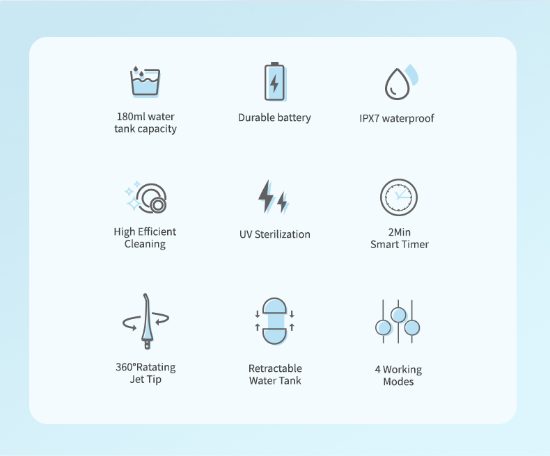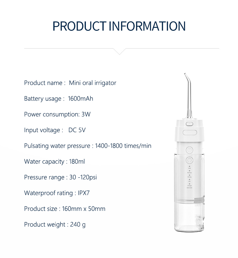 ეს წყლის flosssr სტომატოლოგიური არჩევანი აწვდის წყლის მაღალი წნევის პულსს 1400-1800 ჯერ წუთში, ეფექტურად აშორებს კბილის ნადების 99.9%-ს კბილების ღრმა წმენდისთვის. ეს წყლის ფლოსერი აჯანსაღებს ღრძილებს, ხელს უწყობს სისხლის მიმოქცევას და აგვარებს პირის ღრუს პრობლემებს, როგორიცაა ცუდი სუნი, ორთოდონტიული კბილები.