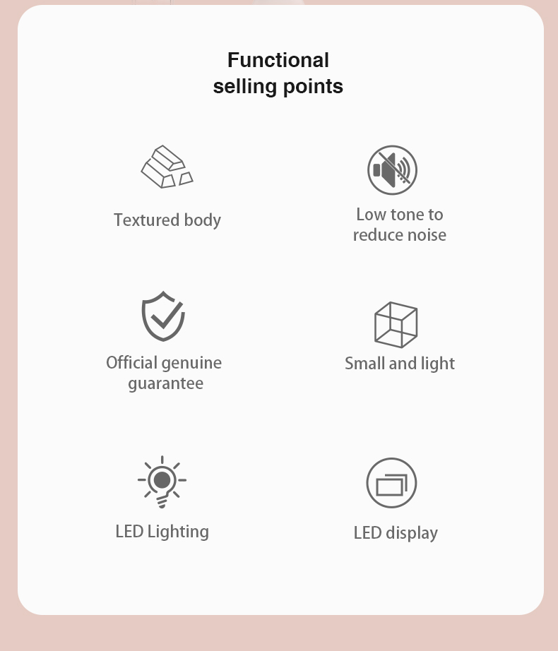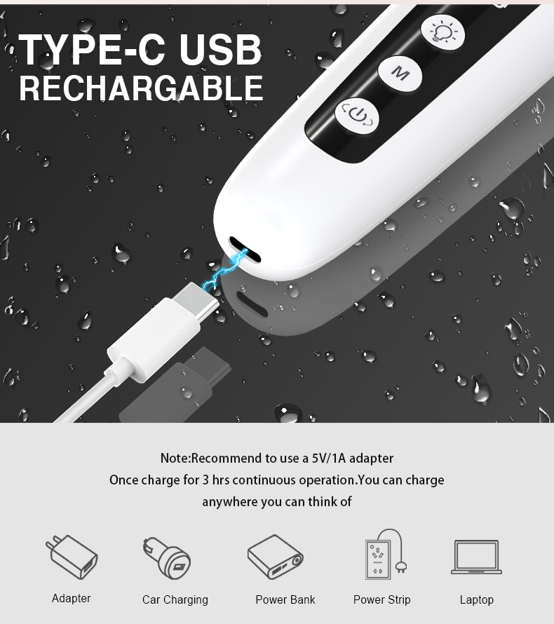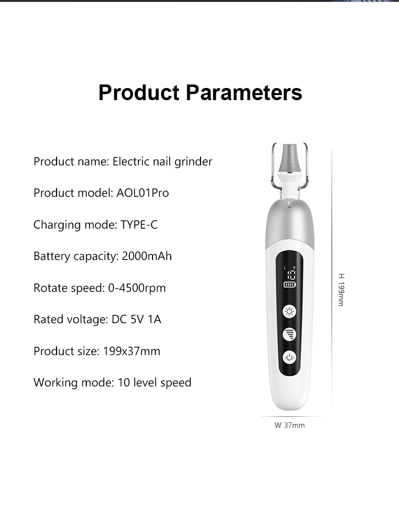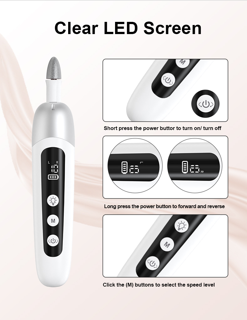 - ინოვაციური LED დისპლეი: შეუფერხებლად გადადით სასურველ პარამეტრებში მარტივად. LED დისპლეი მიუთითებს ბატარეის სტატუსს, სიჩქარის უპირატესობას და როტაციის პარამეტრებს ძალისხმევის მუშაობისთვის. ელექტრო ფრჩხილის მასაჟის აპარატი ასევე აღჭურვილია ინტეგრირებული LED შუქით, რომელიც ანათებს ხელებსა და ფეხებს